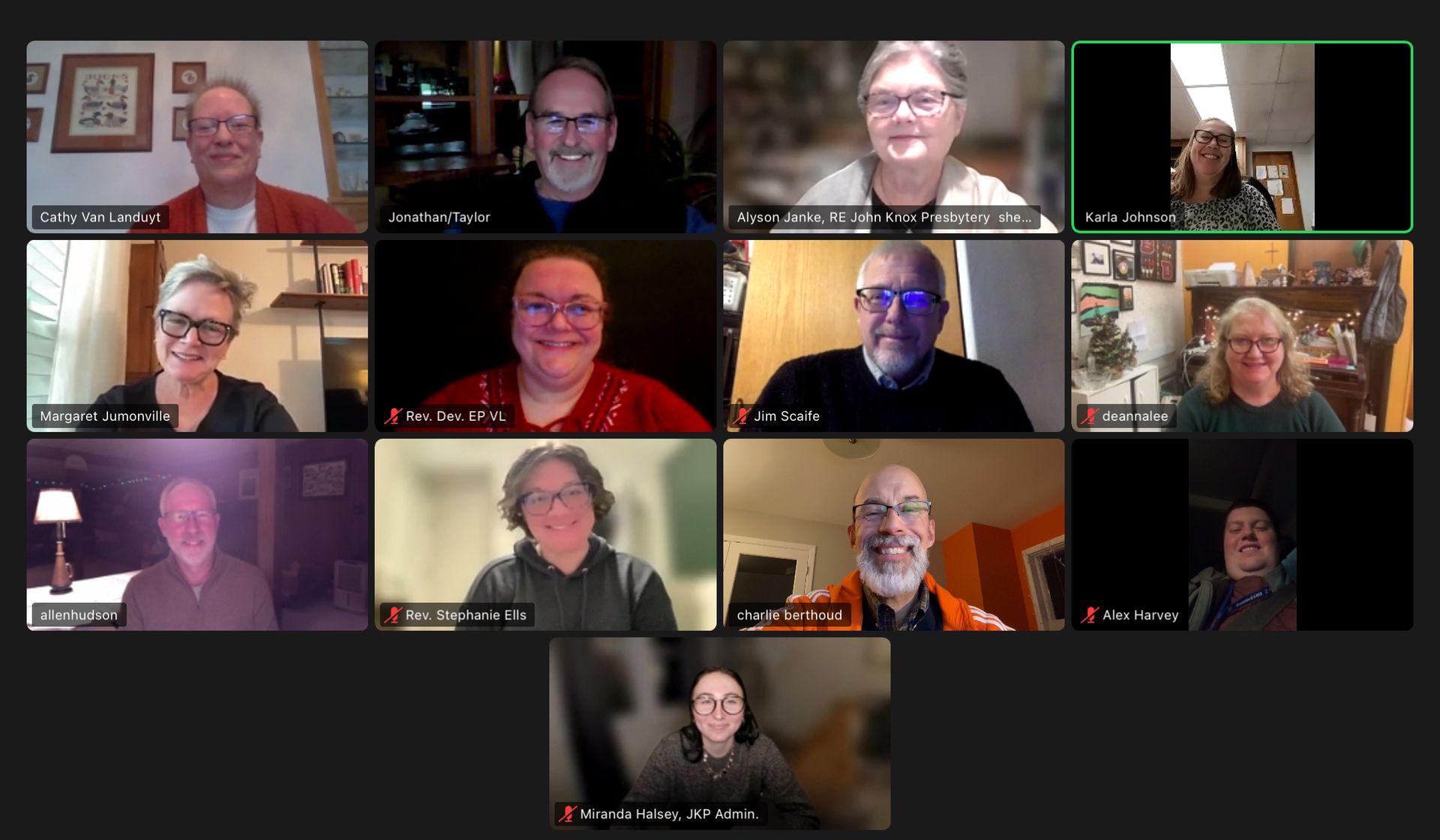 The Presbytery Council includes 12 at-large members—equally divided between ministers and elders—who are geographically representative of the presbytery. Members may serve up to two terms, not exceeding six years total, and are elected in rotating classes. The Council elects its own chair annually. In addition, the current moderator, vice moderator, and immediate past moderator serve as voting ex-officio members. The Executive Presbyter serves as an ex-officio member without vote.